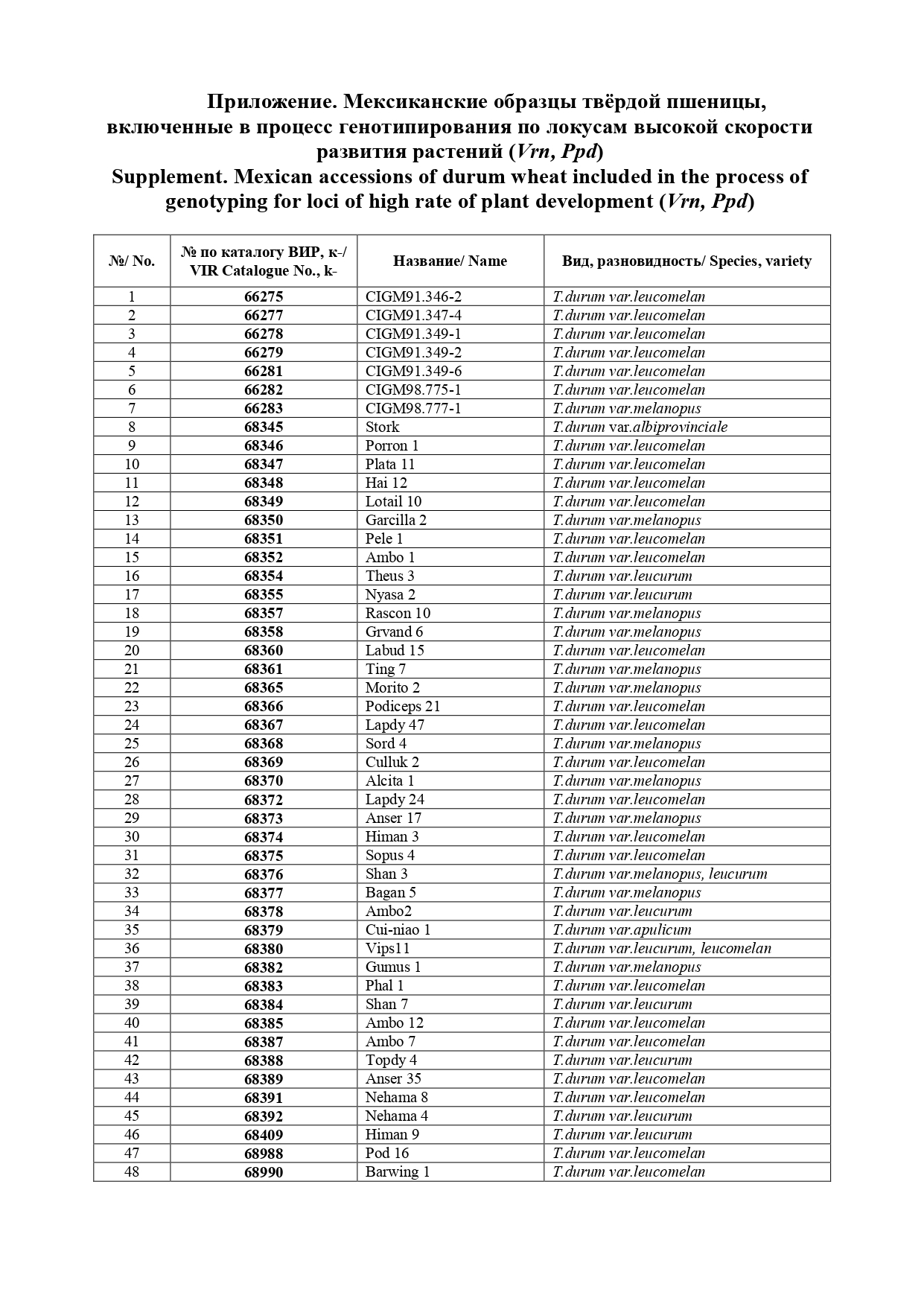 | Тема | Мексиканские образцы твёрдой пшеницы, включенные в процесс генотипирования по локусам высокой скорости развития растений (Vrn, Ppd) | |
